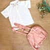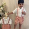 Keep your child snug and smart with this pair of Beige coloured shorts with cross-back suspenders paired with a White collared embroidered shirt and shoes made with our Aloe vera and Lotus fabrics.
